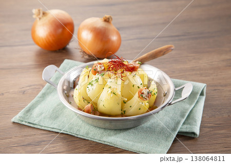 Freshly cooked yellow potatoes with chopped parsley and onion slices in a tray. Concept of boiled potatoes, vegetarian meal, and simple homemade food