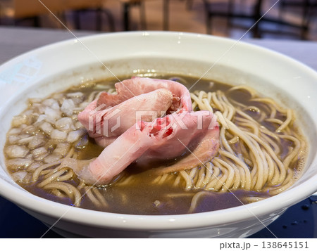 玉ねぎのみじん切りとチャーシューをトッピングした煮干しラーメン。スープのトッピング。