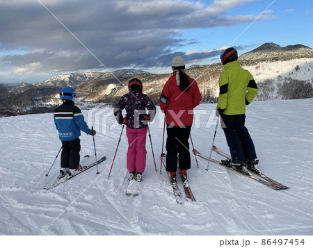 志賀高原熊の湯スキー場 家族でスキー後ろ姿