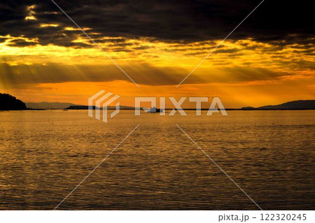 夕焼け光芒を浴びている風流島(たわれじま)「枕草子や伊勢物語など平安時代の書物に登場」宇土市