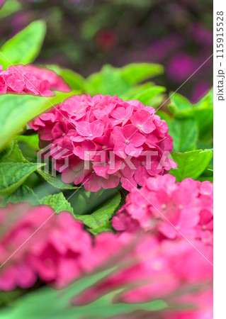 紫陽花の花クローズアップ「ブーゲンビリア運河周辺に咲き乱れるガクアジサイの花」 (八代市日奈久町)