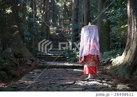熊野古道を歩く平安衣装の女性 タイムスリップしたような風景 大門坂を歩く花装束の女性 イメージ素材