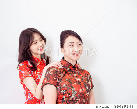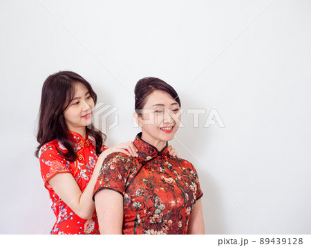 亞洲年輕的女兒幫媽媽按摩紓解壓力(在白色的背景,都穿著傳統的旗袍)