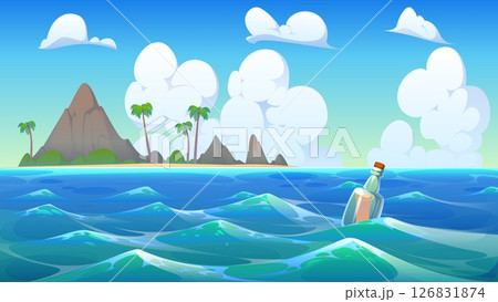 Cartoon sea landscape with glass bottle with pirate treasures map in waves in the background with tropical island with palm trees, green jungle and rocky mountains under clear sky with fluffy clouds