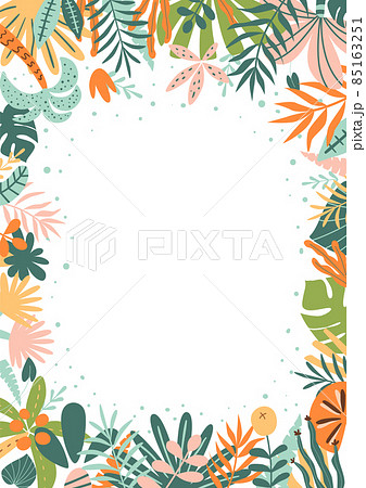 Jungle frame. Tropical leaves, palm leaves, frame nature background. Bright rainforest card. Cute jungle birthday invitation. Safari frame. Vector illustration. Summer foliage of tropical plants trees