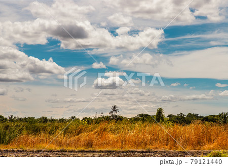 Fields landscape scenery view of Thailand with beautiful morning sunlight clouds and bright blue sky.