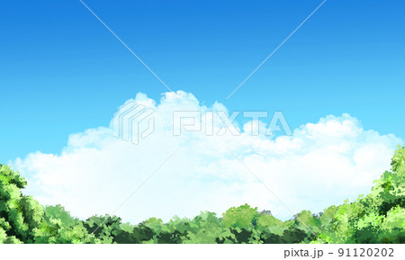 青空に白い入道雲が浮かぶ緑の樹木があるアニメ調の風景02(コピースペースあり)