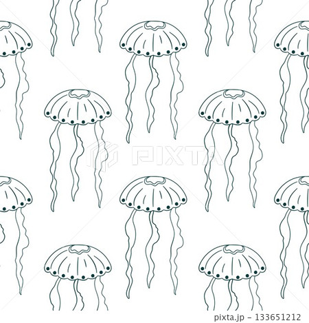 Seamless pattern of blue jellyfish with flowing tentacle on a white background in line art style. Ideal for ocean marine and underwater card design.