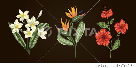 Vector illustration of tropical flower bouquets isolated on white background. Bright realistic hibiscus, strelitzia, plumeria. Floral tropic design elements.