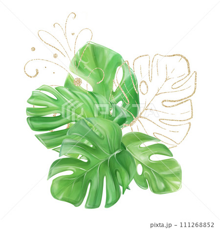 Watercolor bouquet of tropical monstera leaves with golden leaves and a pattern to create a design