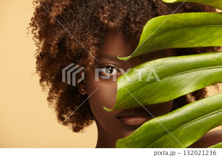 Female nude model of african ethnicity with monstera leaf.