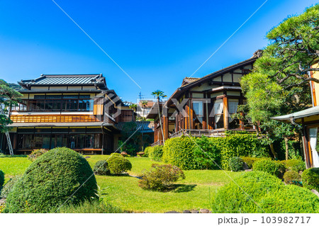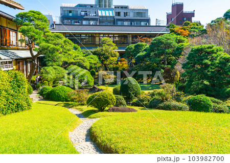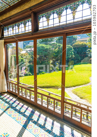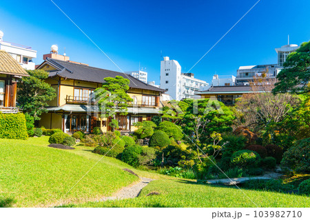 麒麟の間から見た秋晴れの起雲閣の中庭 静岡県熱海市