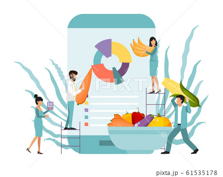 Mobile application for counting calories on smartphone. Tiny people with diagram in big mobile phone and fresh food vegetables count calorie