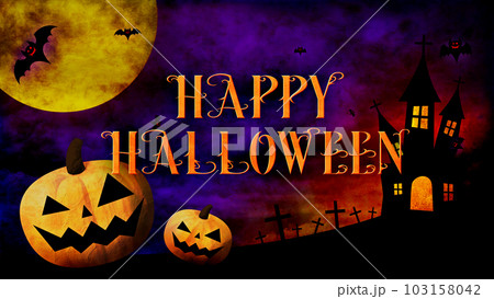 ハッピーハロウィン、色のついた背景にカボチャとコウモリとロゴ