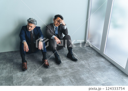 オフィスの床に座り込む二人組のミドルエイジ男性ビジネスパーソン