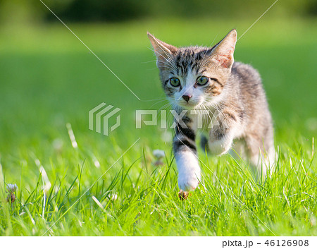 playful tabby cat leaping through lush green field, showcasing its agility and energy under soft natural sunlight. vibrant grass and blurred background enhance dynamic motion.