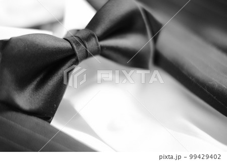 ハンガーにかかったジャケットとシャツと蝶ネクタイ