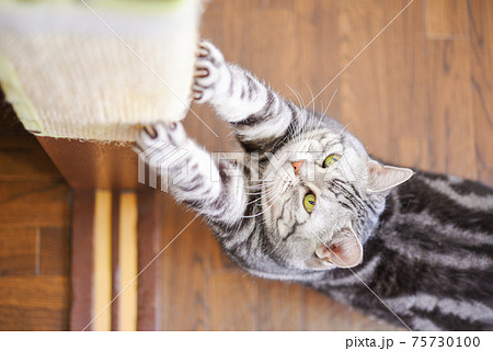 爪研ぎが愛おしくて抱き着く猫のアメリカンショートヘアブルータビー