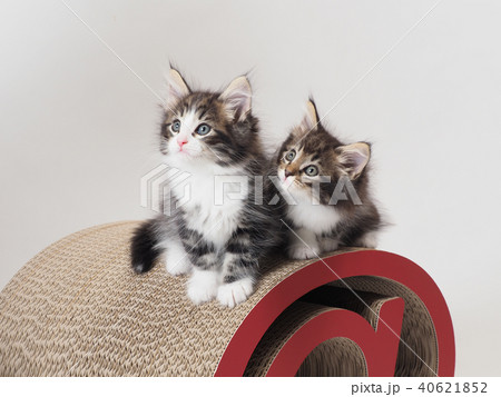 @の形をした爪研ぎに乗った二匹の子猫