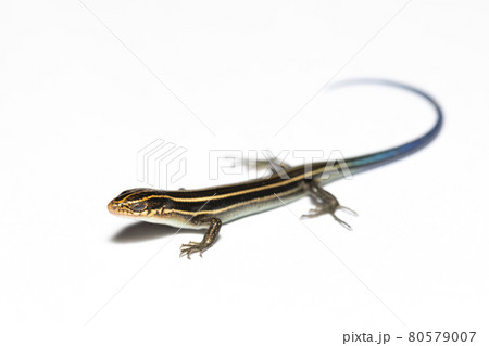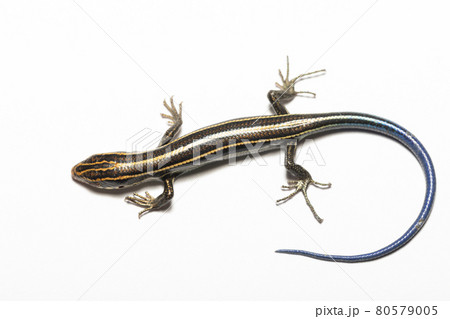 生き物 爬虫類 オキナワトカゲ、幼体です。体には金色にも見える条線が五本、尾は美しいブルーです