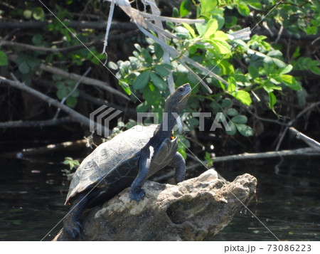 東京都足立区の舎人公園の大池で泳ぐカメのいる風景