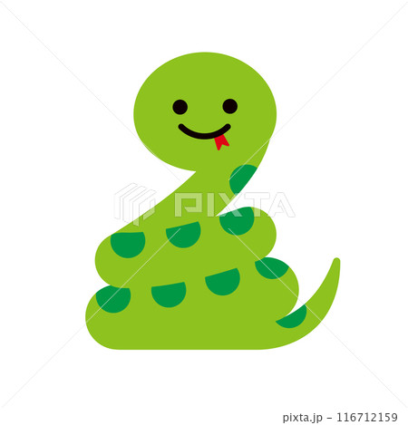とぐろを巻いた、かわいいへびのキャラクターイラスト。シンプルな緑のへびのイラスト素材。