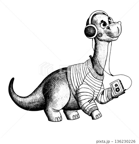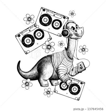 A cute dinosaur in a sweater listens to music on a cassette player with headphones.