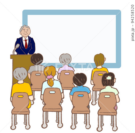 保護者に対して説明会を行う校長先生のイラスト 観葉植物あり