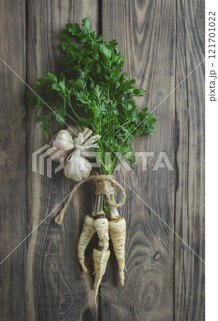 Green fresh parsley with roots and garlic . Fresh herbs for salad. The concept of organic food. Ingredients for salad.