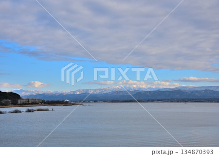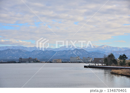《石川県》加賀市柴山潟からみた冠雪の山々と片山津温泉