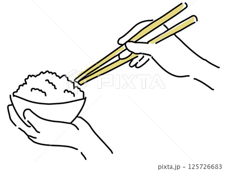 ごはん茶碗と箸を持つ手元のシンプル線画