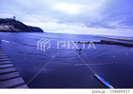 神奈川県 ウィンドサーフィン 背景に鎌倉高校前駅と江ノ電 10月
