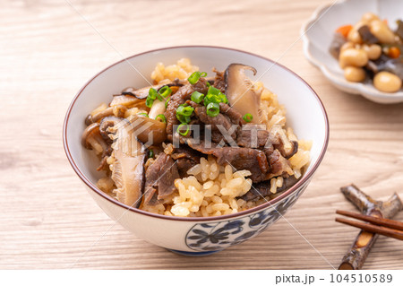 牛しぐれ煮と干し椎茸の煮物の炊き込みご飯