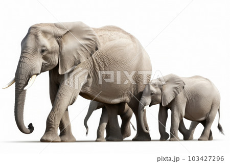 Elephants family isolated on white background, Animal wildlife habitat in the nature forest, beautiful of life, massive body part, largest mammal, with Generative AI.
