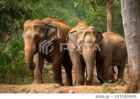 Asia Elephants family walking in the natural park, Animal wildlife habitat in the nature forest, beautiful of life, massive body part, largest mammal, with Generative AI.