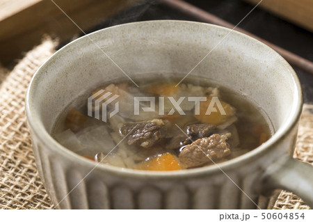 熱々の牛バラ肉と野菜のコンソメスープのアップ