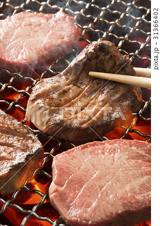 焼肉用の牛タン(牛たん)厚切り/味付き。加熱済、焼いています。