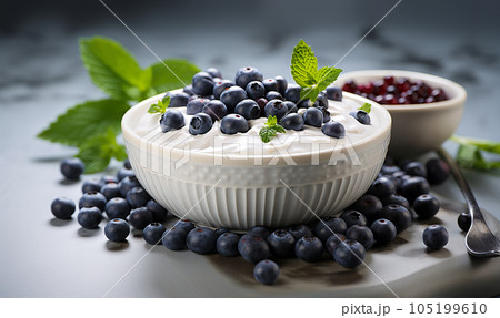 homemade greek yogurt, and fresh berries blueberries in a bowl with a spoon over marble background,side view,selective focus,healhy breakfast food,diner