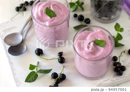 Homemade black currant mousse on wooden table.