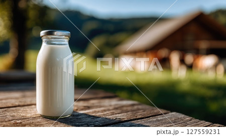 Fresh Bottle of Milk Outdoors on Wooden Table