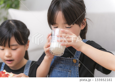 小学生と園児の女児が自宅で飲み物を楽しむ明るい朝の時間