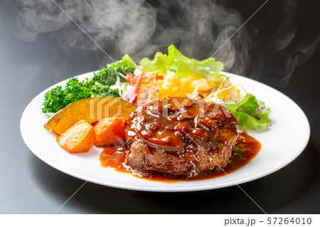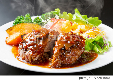 注)湯気は合成です。和風オニオンソースのハンバーグ、牛肉料理、肉料理。