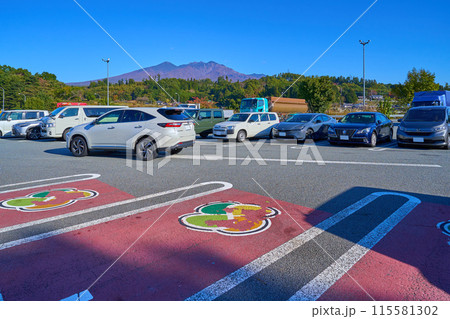 冬の山梨県北杜市の八ヶ岳PA(下り)から駐車両越しに北側の八ヶ岳連峰を見る