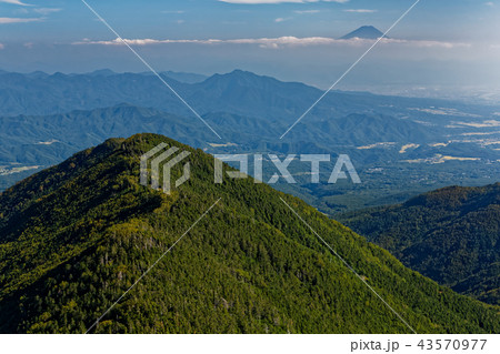 八ヶ岳連峰・真行寺尾根から見る富士山と甲府盆地の町並み