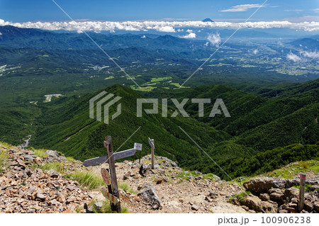 八ヶ岳連峰・真教寺尾根分岐から見る富士山と甲府盆地の町並み