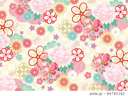 水彩で描いた鞠と紐と花模様の和柄の背景