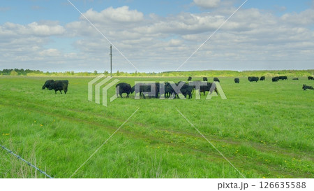 A herd of black cattle is seen grazing peacefully on a lush and verdant green pasture today