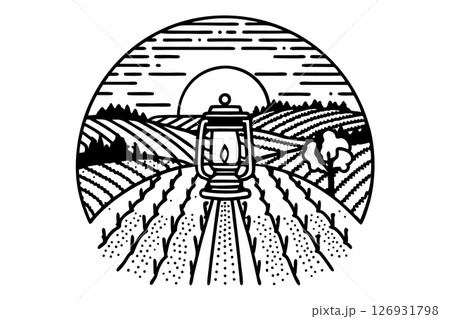 Lantern in sunrise over farmland vintage rural illustration, agriculture field landscape, sunrise horizon, farmland rows, AI Generative