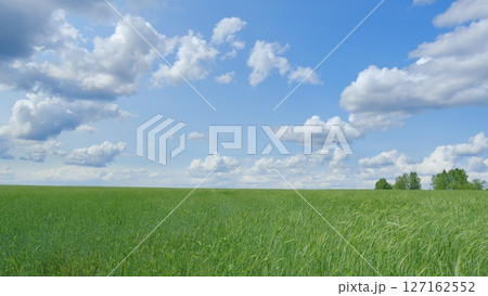 A Sunny Field of Vibrant Green Crops Under a Clear Blue Sky with Fluffy White Clouds
