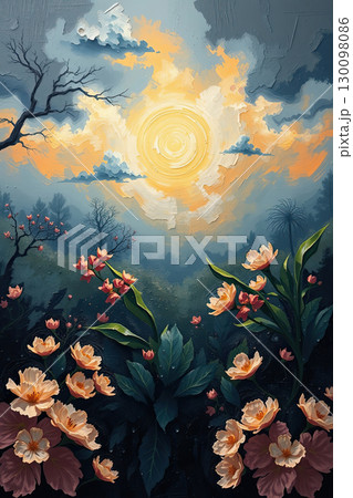 Serene woman surrounded by floral elements in pastel illustration, AI Generative